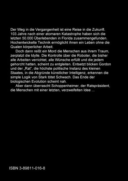 "Der Weg in die Vergangenheit" ist eine Reise in die Zukunft. 103 Jahre nach einer atomaren Katastrophe haben sich die letzten 50.000 Überlebenden in Florida zusammengefunden. Hochentwickelte Technik ermöglicht ihnen ein Leben ohne die Qualen körperlicher Arbeit. Doch dann reißt ein Mord die Menschen aus ihrem Traum, zerplatzt die Idylle. Die Kontrolle über die Roboter, die bisher alle Arbeiten verrichtet, alle Wünsche erfüllt und die jedem gehorcht hatten, scheint zu entgleiten. Entsetzt blicken Gordon und der "Rat", die höchste politische Instanz des kleinen Staates, in die Abgründe künstlicher Intelligenz, erkennen die simple Logik von Stark tötet Schwach. Das Ende der biologischen Evolution scheint nah. Aber dann überrascht Schoppenheimer, der Ratspräsident, die Menschen mit einer letzten, verzweifelten Idee ...