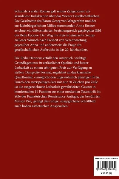 Arthur Schnitzler: Der Weg ins Freie. Roman der Wiener Belle Époque Schnitzlers erster Roman galt seinen Zeitgenossen als skandalöse Indiskretion über das Wiener Gesellschaftsleben. Die Geschichte des Baron Georg von Wergenthin und der aus kleinbürgerlichem Milieu stammenden Anna Rosner zeichnet ein differenziertes, beziehungsreich gespiegeltes Bild der Belle Époque. Der Weg ins Freie ist einerseits Georgs zielloser Wunsch nach Freiheit von Verantwortung gegenüber Anna und andererseits die Frage des gesellschaftlichen Aufbruchs in das 20. Jahrhundert. Großformat, 210 x 297 mm, zweispaltiger…mehr