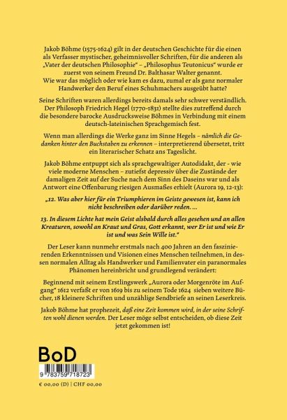 Jakob Böhme (1575-1624) gilt in der deutschen Geschichte für die einen als Verfasser mystischer, geheimnisvoller Schriften, für die anderen als "Vater der deutschen Philosophie" - "Philosophus Teutonicus" wurde er zuerst von seinem Freund Dr. Balthasar Walter genannt. Wie war das möglich oder wie kam es dazu, zumal er als ganz normaler Handwerker den Beruf eines Schuhmachers ausgeübt hatte? Seine Schriften waren allerdings bereits damals sehr schwer verständlich. Der Philosoph Friedrich Hegel (1770-1831) stellte dies zutreffend durch die besondere barocke Ausdrucksweise Böhmes in Verbindung mit einem deutsch-lateinischen Sprachgemisch fest. Wenn man allerdings die Werke ganz im Sinne Hegels - nämlich die Gedanken hinter den Buchstaben zu erkennen - interpretierend übersetzt, tritt ein literarischer Schatz ans Tageslicht. Jakob Böhme entpuppt sich als sprachgewaltiger Autodidakt, der - wie viele moderne Menschen - zutiefst depressiv über die Zustände der damaligen Zeit auf der Suche nach dem Sinn des Daseins war und als Antwort eine Offenbarung riesigen Ausmaßes erhielt (Aurora 19, 12-13): "12. Was aber hier für ein Triumphieren im Geiste gewesen ist, kann ich nicht beschreiben oder darüber reden ... 13. In diesem Lichte hat mein Geist alsbald durch alles gesehen und an allen Kreaturen, sowohl an Kraut und Gras, Gott erkannt, wer Er ist und wie Er ist und was Sein Wille ist." Der Leser kann nunmehr erstmals nach 400 Jahren an den faszinierenden Erkenntnissen und Visionen eines Menschen teilnehmen, in dessen normalen Alltag als Handwerker und Familienvater ein paranormales Phänomen hereinbricht und grundlegend verändert: Beginnend mit seinem Erstlingswerk "Aurora oder Morgenröte im Aufgang" 1612 verfaßt er von 1619 bis zu seinem Tode 1624 sieben weitere Bücher, 18 kleinere Schriften und unzählige Sendbriefe an seinen Leserkreis. Jakob Böhme hat prophezeit, daß eine Zeit kommen wird, in der seine Schriften wohl dienen werden. Der Leser möge selbst entscheiden, ob diese Zeit jetzt gekommen ist!