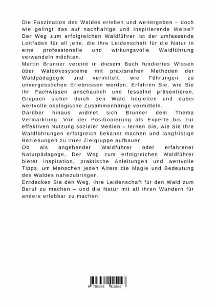 Die Faszination des Waldes erleben und weitergeben - doch wie gelingt das auf nachhaltige und inspirierende Weise? Der Weg zum erfolgreichen Waldführer ist der umfassende Leitfaden für all jene, die ihre Leidenschaft für die Natur in eine professionelle und wirkungsvolle Waldführung verwandeln möchten.Martin Brunner vereint in diesem Buch fundiertes Wissen über Waldökosysteme mit praxisnahen Methoden der Waldpädagogik und vermittelt, wie Führungen zu unvergesslichen Erlebnissen werden. Erfahren Sie, wie Sie Ihr Fachwissen anschaulich und fesselnd präsentieren, Gruppen sicher durch den Wald begleiten und dabei wertvolle ökologische Zusammenhänge vermitteln.Darüber hinaus widmet sich Brunner dem Thema Vermarktung: Von der Positionierung als Experte bis zur effektiven Nutzung sozialer Medien - lernen Sie, wie Sie Ihre Waldführungen erfolgreich bekannt machen und langfristige Beziehungen zu Ihrer Zielgruppe aufbauen.Ob als angehender Waldführer oder erfahrener Naturpädagoge, Der Weg zum erfolgreichen Waldführer bietet Inspiration, praktische Anleitungen und wertvolle Tipps, um Menschen jeden Alters die Magie und Bedeutung des Waldes nahezubringen.Entdecken Sie den Weg, Ihre Leidenschaft für den Wald zum Beruf zu machen - und die Natur mit all ihren Wundern für andere erlebbar zu machen!