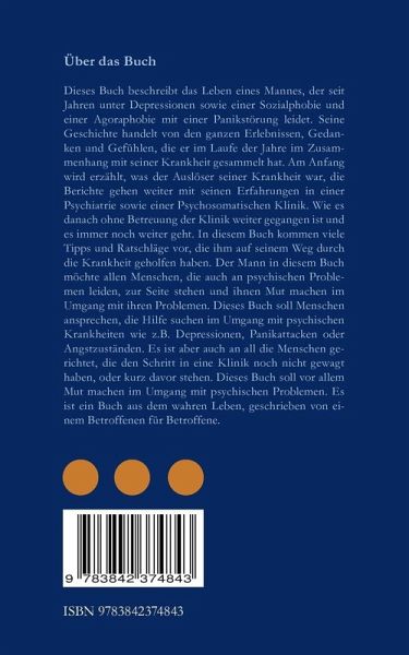 Dieses Buch beschreibt das Leben eines Mannes, der seit Jahren unter Depressionen sowie einer Sozialphobie und einer Agoraphobie mit einer Panikstörung leidet. Seine Geschichte handelt von den ganzen Erlebnissen, Gedanken und Gefühlen, die er im Laufe der Jahre im Zusammenhang mit seiner Krankheit gesammelt hat.Dieses Buch soll Mut machen im Umgang mit psychischen Problemen. Es ist ein Buch aus dem wahren Leben, geschrieben von einem Betroffenen für Betroffene.