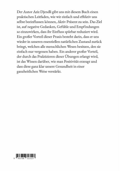 Der Autor Aziz Djendli gibt uns mit diesem Buch einen praktischen Leitfaden, wie wir einfach und effektiv uns selbst beeinflussen können, Aktiv Präsent zu sein. Das Ziel ist, auf negative Gedanken, Gefühle und Empfindungen so einzuwirken, dass ihr Einfluss spürbar reduziert wird. Ein großer Vorteil dieser Praxis besteht darin, dass er uns wieder in unseren essentiellen natürlichen Zustand zurück bringt, welchen alle menschlichen Wesen besitzen, den sie einfach nur vergessen haben. Ein anderer großer Vorteil, der durch das Praktizieren dieser Übungen erlangt wird, ist das Wissen darüber, wie man Positivität erzeugt und dass diese ganz klar unsere Gesundheit in einer ganzheitlichen Weise verstärkt.