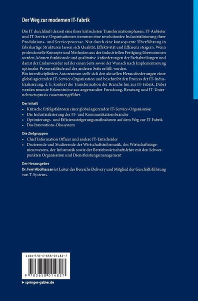 In "Der Weg zur modernen IT-Fabrik" beschreibt ein interdisziplinäres Autorenteam praxisnah und anhand der aktuellen Herausforderungen einer global agierenden IT-Service-Organisation den Prozess der IT-Industrialisierung, d. h. konkret die Transformation der Branche hin zur IT-Factory. Dabei werden neueste Erkenntnisse aus angewandter Forschung, Beratungspraxis und IT-Unternehmenspraxis zusammengeführt.