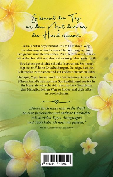 "Dieses Buch muss raus in die Welt! So eine persönliche und ehrliche Geschichte mit so vielen Tipps, Anregungen und Tools habe ich noch nie gelesen." Kristin S., Freundin und YogalehrerinIch schildere in "Der Weg zurück in mein Herz" gefühlvoll, wie ich auf meinem bisherigen Lebensweg mein verlorenes Selbst- und Urvertrauen wiederfinde. Wie ich einen Lebensplan loslassen kann, um einen anderen mutig zu gestalten.Dieses Buch handelt von meinen Erfahrungen mit Depressionen und Krisen. Ein in jungen Jahren erlebtes Trauma, ein unerfüllter Kinderwunsch, jahrelange Hormonbehandlungen und eine Fehlgeburt werfen mich aus der Bahn. Meine beste Entscheidung: Hilfe suchen. Dieser erste Schritt führt mich nach und nach zurück in mein Herz.Wie ich das schaffe, zeige ich mit selbst geschriebenen Gedichten, Auszügen aus meinen Tagebüchern und aus Briefen. Die Lesenden lernen meine Herzensöffner kennen: meine Therapeutin, Yoga, meine Krafttiere. Ich stelle der Leserschaft die Fragen, Menschen, Ratschläge, Tools und Erkenntnisse vor, die mir geholfen haben, die Person zu sein, die ich heute bin. Mehr noch: Ich werfe Fragen auf und inspiriere die Lesenden, diese mutig auch mit ihren Herzen zu beantworten.Das Reisen empfinde ich als essenzielle Heilmethode. Deshalb nehme ich die Lesenden auch mit in meine Seelenheimat Costa Rica - und auf die spirituelle Reise zur Quelle meines wahren Seins."Diese Geschichte ist berührend, inspirierend und macht Mut. Ich habe geweint, aber auch an vielen Stellen geschmunzelt und gelacht - so, wie es bei einem guten Buch sein soll." Anja B., Freundin und Vielleserin"Es kommt der Tag, an dem Mut dich an die Hand nimmt." Ann-Kristin Soyk nimmt uns mit auf ihren Weg, zu jahrelangen Kinderwunschbehandlungen, einer Fehlgeburt und Depressionen. Zu einem Trauma, das sie mit sechzehn erlitt und das erst zwanzig Jahre später heilt. Ihre Lebensgeschichte schenkt Inspiration. Sei mutig, sagt sie, triff deine Entscheidungen. Sie zeigt, dass ein Lebensplan zerbrechen und ein anderer entstehen kann. Therapie, Yoga, Reisen und ihre Seelenheimat Costa Rica führen Ann-Kristin zu ihrer Spiritualität und zurück in ihr Herz. Sie wünscht sich, dass dir ihre Geschichte den Mut gibt, deinen Weg zu finden und dich selbst zu verwirklichen.