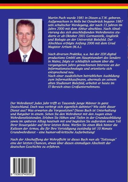 Der Wehrdienst! Jedes Jahr trifft es tausende junge Männer in ganz Deutschland. Doch was verbirgt sich eigentlich dahinter? Wie sieht dieser Dienst aus? Was erwarten die Vorgesetzten? Dieses Buch ist Unterhaltung und Ratgeber in einem. Sehen Sie den Wehrdienst mit den Augen eines Wehrdienstleistenden. Erleben Sie Höhen und Tiefen in der Grundausbildung sowie im späteren Alltag hautnah mit und begleiten Sie außerdem einen Teil Ihrer Steuergelder auf ihrer letzten Reise. Werfen Sie einen Blick hinter die Kulissen der Armee, die für Ihre Verteidigung zuständig ist! 10 Monate Grundwehrdienst - eine humorvoll-kritische Aufarbeitung!Nach der Abschaffung der Wehrpflicht ist dieses Buch nun als "Zeitzeuge" eine der letzten Chancen, etwas über diesen einmaligen Abschnitt der deutschen Geschichte zu erfahren.