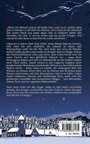 "Setzt ein Mensch sich in die hohle Ulme zu St. Andrä, dann geht er hinüber in die Welt des Winters. Dort herrscht das Schicksal mit einem Fluch und einen Mann hält es verbannt hinter den Gestaden der Zeit. Er ist ein Heiler und ein großer Krieger. Und einmal im Jahr kann er dem Tod ein Leben abtrotzen."Lukas ist 15 und es läuft alles schief: seine Mutter liegt im Sterben, sein Vater hat sich verdrückt, die Zukunft ist düster und Weihnachten steht vor der Tür. Jetzt kann nur noch ein Wunder helfen! Leider glaubt Lukas weder an Wunder noch an Magie. Und an den Weihnachtsmann schon gar nicht.Aber Lukas würde alles für seine Familie und eine glückliche Zukunft tun. Sogar einer Weissagung folgen und sich um Mitternacht in den hohlen Stamm einer Ulme setzen. Damit nimmt er das magische Angebot einer prophetischen Wanderin zwischen den Welten an: Das Leben seiner Mutter retten - wenn Lukas es schafft, die verborgene Welt des Winters zu erlösen. Einer Welt, wo die Nornen das Schicksal jedes Wesens bestimmen und alles daransetzen, dass es so bleibt.Lukas findet Gefährten, Gnome und streitlustige Feen, stellt sich den gehörnten Schabokks und unheimlichen Fängga - und überwindet seinen Trotz und die nagenden Selbstzweifel. Doch alles steht auf der Kippe, wenn es ihm nicht rechtzeitig gelingt, den Krieger zu befreien, der dem Tod ein Leben abringen kann. Denn das Tor zwischen den Welten schließt sich unerbittlich und die Zeit ist knapp.