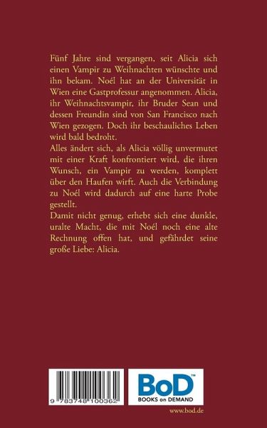 Fünf Jahre sind vergangen, seit Alicia sich einen Vampir zu Weihnachten wünschte und ihn bekam. Noél hat an der Universität in Wien eine Gastprofessur angenommen. Alicia, ihr Weihnachtsvampir, ihr Bruder Sean und dessen Freundin sind von San Francisco nach Wien gezogen. Doch ihr beschauliches Leben wird bald bedroht.Alles ändert sich, als Alicia völlig unvermutet mit einer Kraft konfrontiert wird, die ihren Wunsch, ein Vampir zu werden, komplett über den Haufen wirft. Auch die Verbindung zu Noél wird dadurch auf eine harte Probe gestellt.Damit nicht genug, erhebt sich eine dunkle, uralte Macht, die mit Noél noch eine alte Rechnung offen hat, und gefährdet seine große Liebe: Alicia.