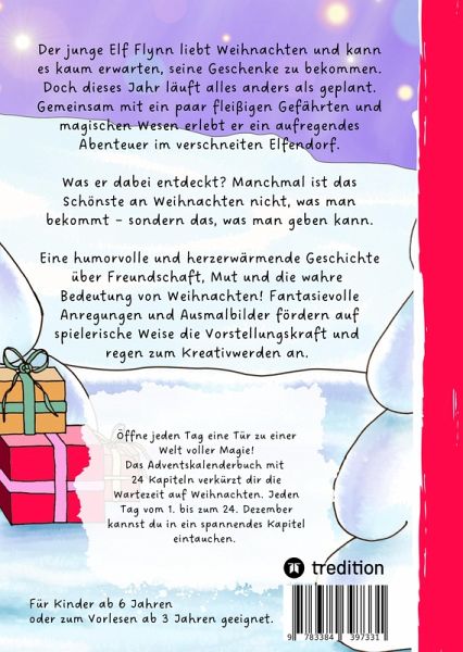 Der junge Elf Flynn liebt Weihnachten und kann es kaum erwarten, seine Geschenke zu bekommen. Doch dieses Jahr läuft alles anders als geplant. Gemeinsam mit ein paar fleißigen Gefährten und magischen Wesen erlebt er ein aufregendes Abenteuer im verschneiten Elfendorf.Was er dabei entdeckt? Manchmal ist das Schönste an Weihnachten nicht, was man bekommt - sondern das, was man geben kann.Eine humorvolle und herzerwärmende Geschichte über Freundschaft, Mut und die wahre Bedeutung von Weihnachten!