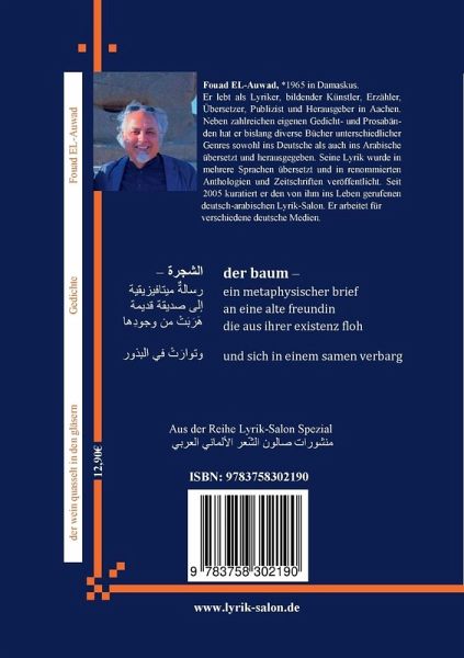Fouad EL-Auwad, *1965 in Damaskus. Er lebt als Lyriker, bildender Künstler, Erzähler, Übersetzer, Publizist und Herausgeber in Aachen. Neben zahlreichen eigenen Gedicht- und Prosabänden hat er bislang diverse Bücher unterschiedlicher Genres sowohl ins Deutsche als auch ins Arabische übersetzt und herausgegeben. Seine Lyrik wurde in mehrere Sprachen übersetzt und in renommierten Anthologien und Zeitschriften veröffentlicht. Seit 2005 kuratiert er den von ihm ins Leben gerufenen deutsch-arabischen Lyrik-Salon. Er arbeitet für verschiedene deutsche Medien.