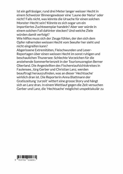 Ist ein gefrässiger, rund drei Meter langer weisser Hecht in einem Schweizer Binnengewässer eine 'Laune der Natur'? Falls nicht, was könnte die Ursache für einen solchen Monster-Hecht sein? Könnte es sich sogar um ein importiertes Zuchtexemplar handeln? Aber wer würde in einem solchen Fall dahinter stecken? Und welche Ziele würden damit verfolgt? Wie hilflos muss sich der Zeuge fühlen, der den sich dem Opfer nähernden weissen Hecht vom Seeufer her sieht und nicht eingreifen kann?Abgerissene Extremitäten, Fleischwunden und Leser-Reportagen über einen weissen Hecht im sonst ruhigen und beschaulichen Thunersee: Schlechte Vorzeichen für die anstehende Sommerferienzeit in der Tourismusregion Berner Oberland. Die Angestellten des Fischereiaufsichtskreises in Faulensee, Jürg Gerber und Christian Lanz, werden beauftragt herauszufinden, was an dieser 'Hechtsache' wirklich dran ist. Die Reporterin Anna Blattmann der Gratiszeitung 'zurzeit' wittert eine grosse Story und hängt sich an Lanz dran. In einem Wettlauf gegen die Zeit versuchen Gerber und Lanz, die 'Hechtsache' möglichst unspektakulär zu erledigen.