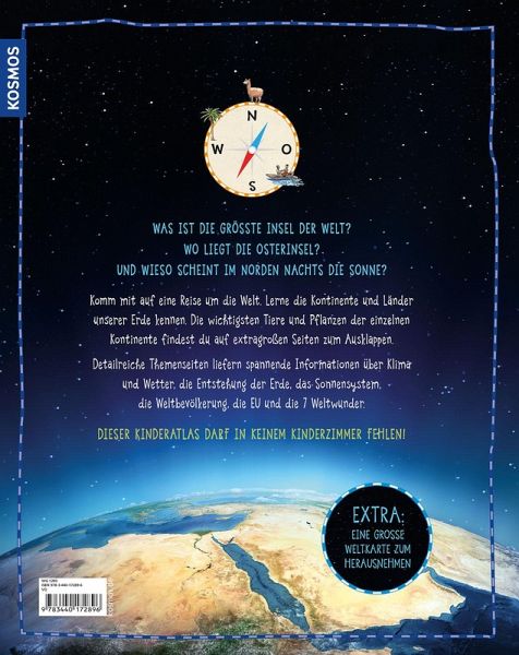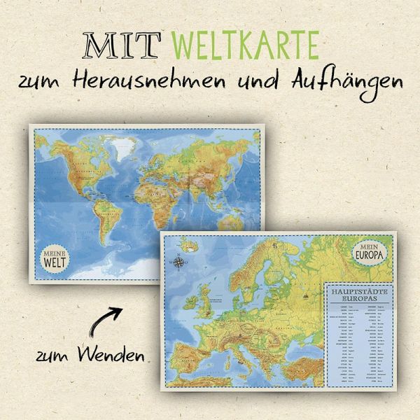 Den Weltatlas aufklappen und schon beginnt eine spannende Reise rund um die Erde. Welche Tiere leben in Asien? In welchem Land wachsen exotische Pflanzen? Wo findet man die Weltwunder? Kinder aus der ganzen Welt präsentieren ihre Heimat. Auf tollen Karten und großen Seiten zum Ausklappen werden die Kontinente und ihre Bewohner, die Pflanzen- und Tierwelt vorgestellt. Indigene Völker, Europapolitik, Vulkane, Klima: Schwerpunkt- und Übersichtsseiten liefern spannende Zusatzinformationen zu besonderen Themen. Auf mehr als 400 Farbfotos und 300 Zeichnungen die Welt, Rekorde, Verrücktes und Besonderheiten entdecken. Mit genauen topografischen Karten für Kinder verständlich. Der Weltatlas liefert Informationen für die Vorbereitung auf Referate. Mit einer Welt- und Europakarte zum Aufhängen. Mit diesem Kinderatlas macht eine Reise um die Welt Spaß!