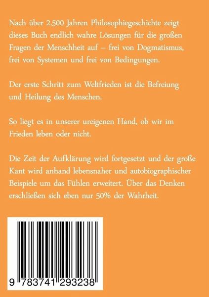 Nach über 2.500 Jahren Philosophiegeschichte zeigt dieses Buch endlich wahre Lösungen für die großen Fragen der Menschheit auf - frei von Dogmatismus, frei von Systemen und frei von Bedingungen.Der erste Schritt zum Weltfrieden ist die Befreiung und Heilung des Menschen.So liegt es in unserer ureigenen Hand, ob wir im Frieden leben oder nicht.Die Zeit der Aufklärung wird fortgesetzt und der große Kant wird anhand lebensnaher und autobiographischer Beispiele um das Fühlen erweitert. Über das Denken erschließen sicheben nur 50% der Wahrheit.