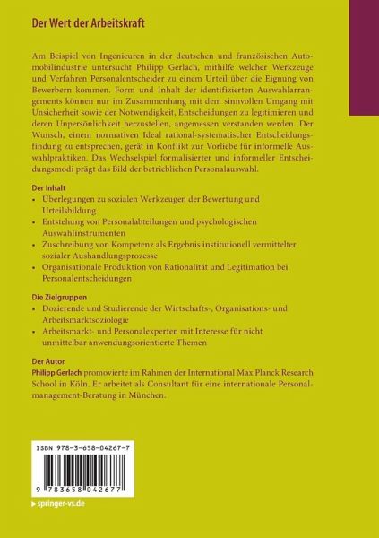 Am Beispiel von Ingenieuren in der deutschen und französischen Automobilindustrie untersucht Philipp Gerlach, mithilfe welcher Werkzeuge und Verfahren Personalentscheider zu einem Urteil über die Eignung von Bewerbern kommen. Form und Inhalt der identifizierten Auswahlarrangements können nur im Zusammenhang mit dem sinnvollen Umgang mit Unsicherheit sowie der Notwendigkeit, Entscheidungen zu legitimieren und deren Unpersönlichkeit herzustellen, angemessen verstanden werden. Der Wunsch, einem normativen Ideal rational-systematischer Entscheidungsfindung zu entsprechen, gerät in Konflikt zur Vorliebe für informelle Auswahlpraktiken. Das Wechselspiel formalisierter und informeller Entscheidungsmodi prägt das Bild der betrieblichen Personalauswahl.