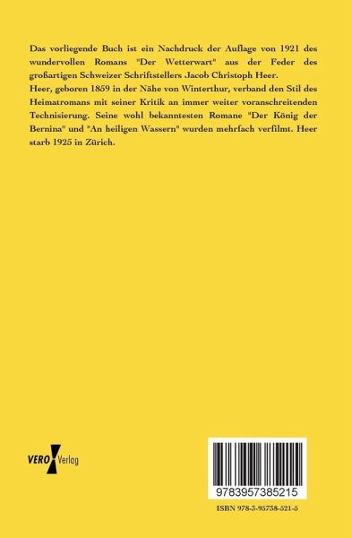 Das vorliegende Buch ist ein Nachdruck der Auflage von 1921 des wundervollen Romans "Der Wetterwart" aus der Feder des großartigen Schweizer Schriftstellers Jacob Christoph Heer.