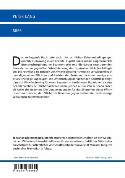 Das vorliegende Buch untersucht die rechtlichen Rahmenbedingungen von Whistleblowing durch Beamte. Es geht dabei auf die eingeschränkte Grundrechtsgeltung im Beamtenrecht und die daraus resultierenden Besonderheiten gegenüber Whistleblowing durch privatrechtlich Beschäftigte ein. Die rechtliche Zulässigkeit von Whistleblowing richtet sich vorwiegend nach den allgemeinen Pflichten und Rechten der Beamten, da es nur wenige ausdrückliche Regelungen gibt. Die Untersuchung der geltenden Rechtslage zeigt, dass sich Whistleblowing für einen Beamten in bestimmten Situationen als eine beamtenrechtliche Pflicht darstellen kann, jedoch nur in sehr seltenen Fällen als Recht des Beamten. Die Voraussetzungen für das Eingreifen dieser Pflicht orientieren sich an der Pflicht des Beamten gegen bestimmte rechtswidrige Weisungen zu remonstrieren.