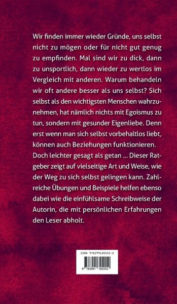 Wir finden immer wieder Gründe, uns selbst nicht zu mögen oder für nicht gut genug zu empfinden. Mal sind wir zu dick, dann zu unsportlich, dann wieder zu wertlos im Vergleich mit anderen. Warum behandeln wir oft andere besser als uns selbst? Sich selbst als den wichtigsten Menschen wahrzunehmen, hat nämlich nichts mit Egoismus zu tun, sondern mit gesunder Eigenliebe. Denn erst wenn man sich selbst vorbehaltlos liebt, können auch Beziehungen funktionieren. Doch leichter gesagt als getan ... Dieser Ratgeber zeigt auf vielseitige Art und Weise, wie der Weg zu sich selbst gelingen kann. Zahlreiche Übungen und Beispiele helfen ebenso dabei wie die einfühlsame Schreibweise der Autorin, die mit persönlichen Erfahrungen den Leser abholt.