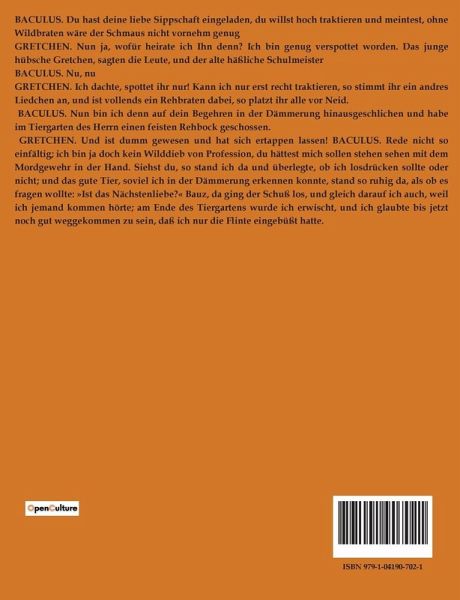 BACULUS. Du hast deine liebe Sippschaft eingeladen, du willst hoch traktieren und meintest, ohne Wildbraten wäre der Schmaus nicht vornehm genug GRETCHEN. Nun ja, wofür heirate ich Ihn denn? Ich bin genug verspottet worden. Das junge hübsche Gretchen, sagten die Leute, und der alte häßliche Schulmeister BACULUS. Nu, nu GRETCHEN. Ich dachte, spottet ihr nur! Kann ich nur erst recht traktieren, so stimmt ihr ein andres Liedchen an, und ist vollends ein Rehbraten dabei, so platzt ihr alle vor Neid. BACULUS. Nun bin ich denn auf dein Begehren in der Dämmerung hinausgeschlichen und habe im Tiergarten des Herrn einen feisten Rehbock geschossen. GRETCHEN. Und ist dumm gewesen und hat sich ertappen lassen! BACULUS. Rede nicht so einfältig; ich bin ja doch kein Wilddieb von Profession, du hättest mich sollen stehen sehen mit dem Mordgewehr in der Hand. Siehst du, so stand ich da und überlegte, ob ich losdrücken sollte oder nicht; und das gute Tier, soviel ich in der Dämmerung erkennen konnte, stand so ruhig da, als ob es fragen wollte: »Ist das Nächstenliebe?« Bauz, da ging der Schuß los, und gleich darauf ich auch, weil ich jemand kommen hörte; am Ende des Tiergartens wurde ich erwischt, und ich glaubte bis jetzt noch gut weggekommen zu sein, daß ich nur die Flinte eingebüßt hatte.
