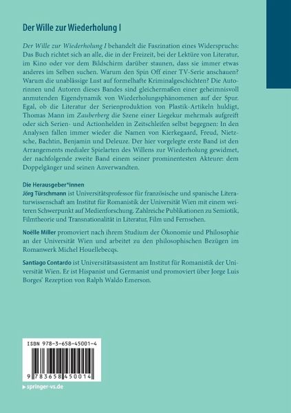Der Wille zur Wiederholung behandelt die Faszination eines Widerspruchs: Er richtet sich an alle, die in der Freizeit, bei der Lektüre von Literatur, im Kino oder vor dem Bildschirm darüber staunen, dass sie immer etwas anderes im Selben suchen. Warum den Spin Off einer TV-Serie anschauen? Warum die unablässige Lust auf formelhafte Kriminalgeschichten? Die Autorinnen und Autoren dieses Bandes sind gleichermaßen einer geheimnisvoll anmutenden Eigendynamik von Wiederholungsphänomenen auf der Spur. Egal, ob die Literatur der Serienproduktion von Plastik-Artikeln huldigt, Thomas Mann im Zauberberg die Szene einer Liegekur mehrmals aufgreift oder sich Serien- und Actionhelden in Zeitschleifen selbst begegnen: In den Analysen fallen immer wieder die Namen von Kierkegaard, Freud, Nietzsche, Bachtin, Benjamin und Deleuze. Der hier vorgelegte erste Band ist den Arrangements medialer Spielarten des Willens zur Wiederholung gewidmet, der nachfolgende zweite Band einem seiner prominentesten Akteure: dem Doppelgänger und seinen Anverwandten.