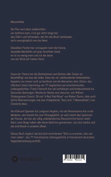 Im Buch werden neue Übersetzungen von 77 englischen und amerikanischen Liebesgedichten präsentiert, die den Originaltexten zeilengenau gegenübergestellt sind. In Sinn und Ton sind alle diese Übersetzungen den Originalen verhaftet, so dass ihre Lektüre auch ohne Kenntnis der Originale ein Vergnügen ist. Die Auswahl der Werke reicht von der Renaissance bis in die Moderne, von Edmund Spenser über Robert Burns und Edgar Allen Poe bis Langston Hughes. Berühmte Werke finden sich darin genauso wie echte Überraschungen. Gemeinsam ist allen diesen Gedichten: sie sind zeitlos und sie sind Musik in unseren Ohren.