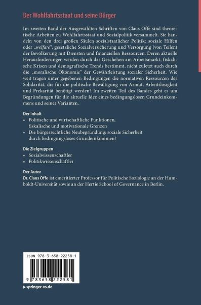 Im zweiten Band der Ausgewählten Schriften von Claus Offe sind theoretische Arbeiten zu Wohlfahrtsstaat und Sozialpolitik versammelt. Sie handeln von den drei großen Säulen sozialstaatlicher Politik: soziale Hilfen oder "welfar", gesetzliche Sozialversicherung und Versorgung von (Teilen) der Bevölkerung mit Diensten und finanziellen Ressourcen. Deren aktuelle Herausforderungen werden durch das Geschehen am Arbeitsmarkt, fiskalische Krisen und demografische Trends bestimmt, nicht zuletzt auch durch die "moralische Ökonomie" der Gewährleistung sozialer Sicherheit. Wie weit tragen unter gegebenen Bedingungen die normativen Ressourcen der Solidarität, die für die politische Bewältigung von Armut, Arbeitslosigkeit und Prekarität benötigt werden? Im zweiten Teil des Bandes geht es um Begründungen für die aktuelle Idee eines bedingungslosen Grundeinkommens und seiner Varianten.