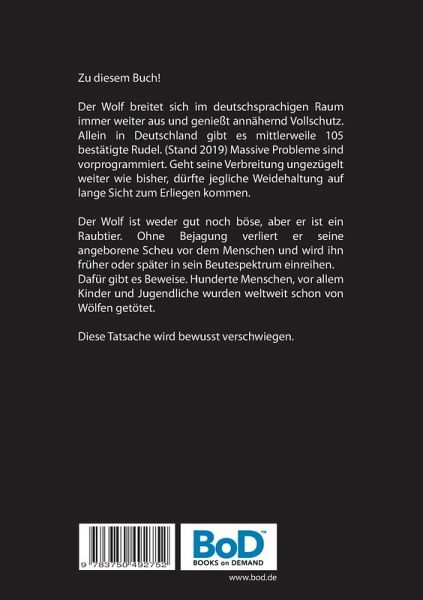 Der Wolf breitet sich im deutschsprachigen Raum immer weiter aus und genießt annähernd Vollschutz. Allein in Deutschland gibt es mittlerweile 105 bestätigte Rudel (Stand 2019). Massive Probleme sind vorprogrammiert. Geht seine Verbreitung ungezügelt weiter wie bisher, dürfte jegliche Weidehaltung auf lange Sicht zum Erliegen kommen. Der Wolf ist weder gut noch böse, aber er ist ein Raubtier. Ohne Bejagung verliert er seine angeborene Scheu vor dem Menschen und wird ihn früher oder später in sein Beutespektrum einreihen. Dafür gibt es Beweise. Hunderte Menschen, vor allem Kinder und Jugendliche, wurden weltweit schon von Wölfen getötet. Diese Tatsache wird bewusst verschwiegen.