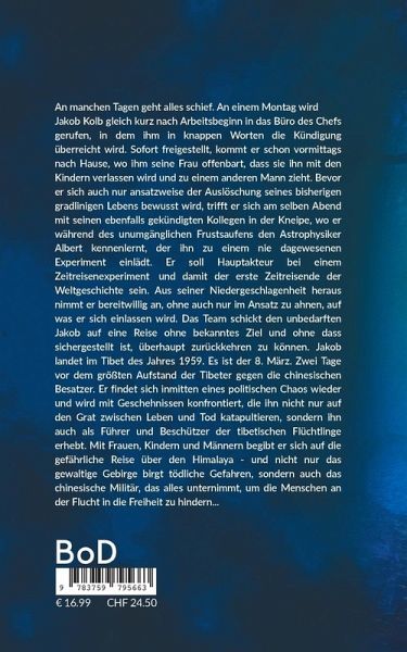 An manchen Tagen geht alles schief. An einem Montag wird Jakob Kolb gleich kurz nach Arbeitsbeginn in das Büro des Chefs gerufen, in dem ihm in knappen Worten die Kündigung überreicht wird. Sofort freigestellt, kommt er schon vormittags nach Hause, wo ihm seine Frau offenbart, dass sie ihn mit den Kindern verlassen wird und zu einem anderen Mann zieht. Bevor er sich auch nur ansatzweise der Auslöschung seines bisherigen gradlinigen Lebens bewusst wird, trifft er sich am selben Abend mit seinen ebenfalls gekündigten Kollegen in der Kneipe, wo er während des unumgänglichen Frustsaufens den Astrophysiker Albert kennenlernt, der ihn zu einem nie dagewesenen Experiment einlädt. Er soll Hauptakteur bei einem Zeitreisenexperiment und damit der erste Zeitreisende der Weltgeschichte sein. Aus seiner Niedergeschlagenheit heraus nimmt er bereitwillig an, ohne auch nur im Ansatz zu ahnen, auf was er sich einlassen wird. Das Team schickt den unbedarften Jakob auf eine Reise ohne bekanntes Ziel und ohne dass sichergestellt ist, überhaupt zurückkehren zu können. Jakob landet im Tibet des Jahres 1959. Es ist der 8. März. Zwei Tage vor dem größten Aufstand der Tibeter gegen die chinesischen Besatzer. Er findet sich inmitten eines politischen Chaos wieder und wird mit Geschehnissen konfrontiert, die ihn nicht nur auf den Grat zwischen Leben und Tod katapultieren, sondern ihn auch als Führer und Beschützer der tibetischen Flüchtlinge erhebt. Mit Frauen, Kindern und Männern begibt er sich auf die gefährliche Reise über den Himalaya - und nicht nur das gewaltige Gebirge birgt tödliche Gefahren, sondern auch das chinesische Militär, das alles unternimmt, um die Menschen an der Flucht in die Freiheit zu hindern...