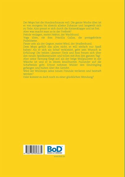 Der Mops hat die Hundeschnauze voll: Die ganze Woche über ist er von morgens bis abends alleine Zuhause und langweilt sich zu Tode. Also presst er sich durch die Katzenklappe und ist frei. Aber was macht man so in der Freiheit?Feinde verjagen, meint Hektor, der Wachhund.Yoga üben, rät ihm Priscilla Callas, die preisgekrönte Pudeldame. Fieser sein als der Gegner, meint Wind, der Straßenhund. Dem Mops gefällt das alles nicht, er will einfach nur Spaß haben! Als er sich als Schaf verkleidet, geht sein Wunsch in Erfüllung! Die beiden Lämmer Fleck und Rosi freuen sich über den neuen Spielkameraden und tollen mit ihm den ganzen Tag!Aber seine Tarnung fliegt auf, als der beige Wollpullover in der Wäsche ist und er in einem knallbunten Pullunder auf die Schafweide geht. Erbost nehmen Widder den Eindringling gefangen und halten über ihn Gericht. Wird der Wollmops seine neuen Freunde verlieren und bestraft werden?Oder kommt es doch noch zu einer glücklichen Wendung?