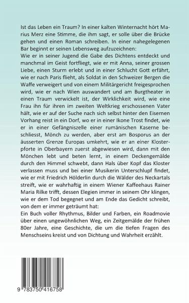Ist das Leben ein Traum? In einer kalten Winternacht hört Marius Merz eine Stimme, die ihm sagt, er solle über die Brücke gehen und einen Roman schreiben. In einer nahegelegenen Bar beginnt er seinen Lebensweg aufzuzeichnen:Wie er in seiner Jugend die Gabe des Dichtens entdeckt und manchmal im Geist fortfliegt, wie er mit Anna, seiner grossen Liebe, einen Sturm erlebt und in einer Schlucht Gott erfährt, wie er nach Paris flieht, als Soldat in den Schweizer Bergen die Waffe verweigert und von einem Militärgericht freigesprochen wird, wie er nach Wien auswandert und am Burgtheater in einen Traum verwickelt ist, der Wirklichkeit wird, wie eine Frau ihn für ihren im zweiten Weltkrieg erschossenen Vater hält, wie er auf der Suche nach sich selbst hinter den Eisernen Vorhang reist in ein Dorf, wo er in einer Ikone Trost findet, wie er in einer Gefängniszelle einer rumänischen Kaserne beschliesst, Mönch zu werden, aber erst am Bosporus an der äusserten Grenze Europas umkehrt, wie er an einer Klosterpforte in Oberbayern zuerst abgewiesen wird, dann mit den Mönchen lebt und beten lernt, in einem Deckengemälde durch den Himmel schwebt, dann Hals über Kopf das Kloster verlassen muss und bei einer Musikerin Unterschlupf findet, wie er mit Friedrich Hölderlin durch die Wälder des Neckartals streift, wie er wahrhaftig in einem Wiener Kaffeehaus Rainer Maria Rilke trifft, dessen Elegien immer in seinem Ohr klingen, wie er dem Tod begegnet und am Ende das Gedicht schreibt, von dem er immer geträumt hat:Ein Buch voller Rhythmus, Bilder und Farben, ein Roadmovie über einen ungewöhnlichen Weg, ein Zeitgemälde der frühen 80er Jahre, eine Geschichte, die um die tiefen Fragen des Menschseins kreist und von Dichtung und Wahrheit erzählt.
