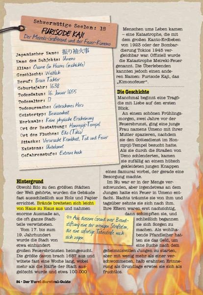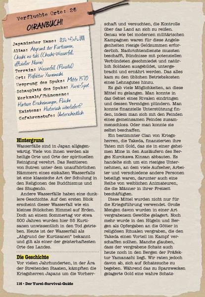 Yurei ist das japanische Wort für "Geist". Sie sind die Seelen der Toten, die nicht in der Lage - oder nicht willens - sind, ihre sterbliche Hülle zu verlassen. Zwar ist nicht jeder Yurei gefährlich, aber sie alle werden von Wut, Trauer oder Rachegelüsten angetrieben. Manche sind der festen Überzeugung, dass sie noch leben. Lerne 40 gruselige Geister und verfluchte Orte in diesem Jenseits-Guide kennen! Hast du schon dem sexy Geist Oiwa, dem Schrecken von Yotsuva oder Rokujo, dem wütenden Geist aus dem Märchen von Genji, gehört? Tauche in japanische Märchen, die Kultur und Mythologie ein und erfahre alles über die furchterregendsten Geister, Spukorte und okkulte Rituale. Lass dich in einer illustrierten Tour in die (Unter-) Welt entführen und überlebe mit diesem Leitfaden die Begegnung mit dem Übernatürlichen.Entstellte Gesichter, durchscheinende Körper und weiße Grabkimonos - Yurei sind japanische Geister, Seelen der Toten, die nicht in der Lage - oder nichtwillens - sind, ihre sterblichen Hüllen zu verlassen und die Menschen heimsuchen. Doch woher stammen diese unheimlichen Wesen? Wie starben sie? Und, vielleicht am wichtigsten: Wie wehrst du einen Yurei-Angri_ ab? Folge der Spur der Totengeister bis ins Jenseits und erfahre alles über die furchterregendsten Geister, verfluchten Orte und okkulten Rituale, die heute noch in zahlreichen Manga, Anime und J-Horrorfilmen zu finden sind. 40 Steckbriefe berühmter Geister, unterhaltsam und fundiert recherchiert und illustriert im Manga-Style - dieses Buch ist ein Muss für jeden Liebhaber der ungewöhnlichen und skurrilen japanischen Geistergeschichten und das perfekte Geschenk für alle Fans japanischer Pop-Kultur!