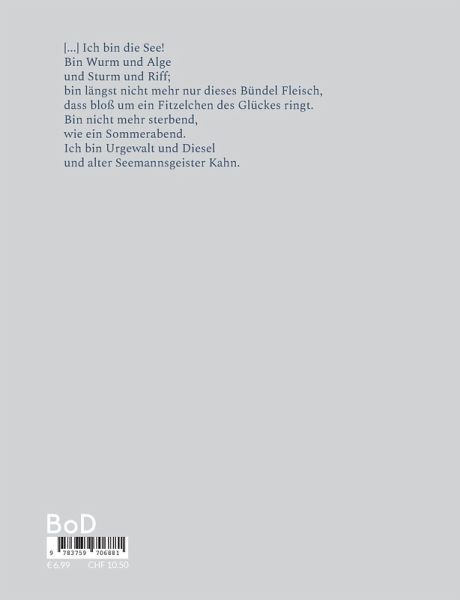 [...] Ich bin die See!Bin Wurm und Algeund Sturm und Riff;bin längst nicht mehr nur dieses Bündel Fleisch,dass bloß um ein Fitzelchen des Glückes ringt.Bin nicht mehr sterbend,wie ein Sommerabend.Ich bin Urgewalt und Dieselund alter Seemannsgeister Kahn.