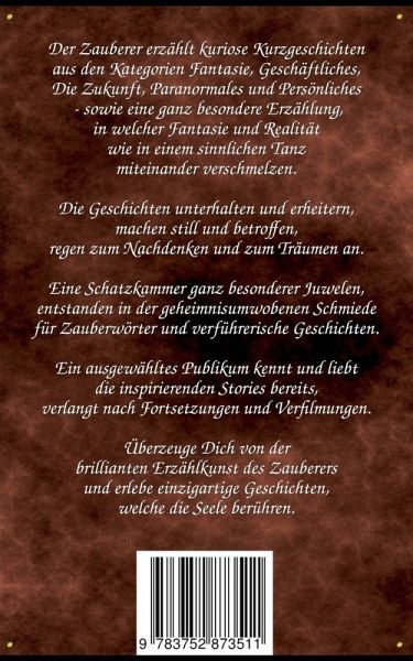 Der Zauberer erzählt kuriose Kurzgeschichten aus den Kategorien Fantasie, Geschäftliches, Die Zukunft, Paranormales und Persönliches - sowie eine ganz besondere Erzählung, in welcher Fantasie und Realität wie in einem sinnlichen Tanz miteinander verschmelzen. Die Geschichten unterhalten und erheitern, machen still und betroffen, regen zum Nachdenken und zum Träumen an.Eine Schatzkammer ganz besonderer Juwelen, entstanden in der geheimnisumwobenen Schmiede für Zauberwörter und verführerische Geschichten.Ein ausgewähltes Publikum kennt und liebt die inspirierenden Stories bereits, verlangt nach Fortsetzungen und Verfilmungen.Überzeuge Dich von der brillanten Erzählkunst des Zauberers und erlebe einzigartige Geschichten, welche die Seele berühren.