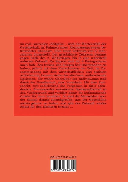 Der Zeitgeist, Drama der Menschheit in 2 Akten. Im real- surrealen »Zeitgeist« - wird der Werteverfall der Gesellschaft, im Rahmen eines Abendessens zweier befreundeter Ehepaare, über einen Zeitraum von 6 Jahrzehnten dargestellt. Der geschilderte Zeitraum beginnt gegen Ende des 2. Weltkrieges, bis in eine unheilvoll nahende Zukunft. Zu Beginn sind die 4 Protagonisten noch froh, den Irrsinn des Krieges heil überstanden zu haben, jedoch mit dem Fortschreiten der Zeit, im Zusammenhang mit dem wirtschaftlichen und sozialen Aufschwung, kommt wieder der alte Geist, aufbrechende Egoismen, der wahre Charakter des Individuums und damit der Gesellschaft, zum Vorschein. Mit dem Fortschritt tritt schleichend das Vergessen in einer dekadenten, Statussymbol orientierten Spaßgesellschaft in den Vordergrund und verklärt damit die aufkommende Gefahr für neue Konflikte. So darf die Menschheit wieder einmal darauf zurückgreifen aus der Geschichte nichts gelernt zu haben und gibt der Zukunft wieder Raum für den nächsten Irrsinn ...