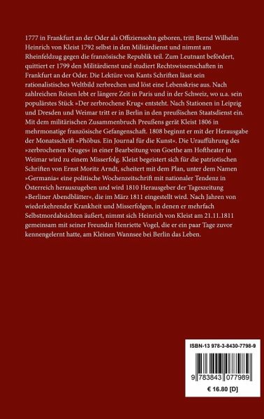 1777 in Frankfurt an der Oder als Offizierssohn geboren, tritt Bernd Wilhelm Heinrich von Kleist 1792 selbst inden Militärdienst und nimmt am Rheinfeldzug gegen die französische Republik teil. Zum Leutnant befördert, quittiert er 1799 den Militärdienst und studiert Rechtswissenschaften in Frankfurt an der Oder. Die Lektüre von Kants Schriften lässt sein rationalistisches Weltbild zerbrechen und löst eine Lebenskrise aus. Nach zahlreichen Reisen lebt er längere Zeit in Paris und in der Schweiz, wo u.a. sein populärstes Stück "Der zerbrochene Krug" entsteht. Nach Stationen in Leipzig und Dresden und Weimar tritt er in Berlin in den preußischen Staatsdienst ein. Mit dem militärischen Zusammenbruch Preußens gerät Kleist 1806 in mehrmonatige französische Gefangenschaft. 1808 beginnt er mit der Herausgabe der Monatsschrift "Phöbus. Ein Journal für die Kunst". Die Uraufführung des "zerbrochenen Kruges" in einer Bearbeitung von Goethe am Hoftheater in Weimar wird zu einem Misserfolg. Kleist begeistert sich für die patriotischen Schriften von Ernst Moritz Arndt, scheitert mit dem Plan, unter dem Namen "Germania" eine politische Wochenzeitschrift mit nationaler Tendenz in Österreich herauszugeben und wird 1810 Herausgeber der Tageszeitung "Berliner Abendblätter", die im März 1811 eingestellt wird. Nach Jahren von wiederkehrender Krankheit und Misserfolgen, in denen er mehrfach Selbstmordabsichten äußert, nimmt sich Heinrich von Kleist am 21.11.1811 gemeinsam mit seiner Freundin Henriette Vogel, die er ein paar Tage zuvor kennengelernt hatte, am Kleinen Wannsee bei Berlin das Leben.