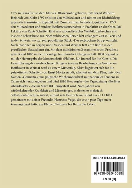 1777 in Frankfurt an der Oder als Offizierssohn geboren, tritt Bernd Wilhelm Heinrich von Kleist1792 selbst in den Militärdienst und nimmt am Rheinfeldzug gegen die französische Republik teil. Zum Leutnant befördert, quittiert er 1799 den Militärdienst und studiert Rechtswissenschaften in Frankfurt an der Oder. Die Lektüre von Kants Schriften lässt sein rationalistisches Weltbild zerbrechen und löst eine Lebenskrise aus. Nach zahlreichen Reisen lebt er längere Zeit in Paris und in der Schweiz, wo u.a. sein populärstes Stück "Der zerbrochene Krug" entsteht. Nach Stationen in Leipzig und Dresden und Weimar tritt er in Berlin in den preußischen Staatsdienst ein. Mit dem militärischen Zusammenbruch Preußens gerät Kleist 1806 in mehrmonatige französische Gefangenschaft. 1808 beginnt er mit der Herausgabe der Monatsschrift "Phöbus. Ein Journal für die Kunst". Die Uraufführung des "zerbrochenen Kruges" in einer Bearbeitung von Goethe am Hoftheater in Weimar wird zu einem Misserfolg. Kleist begeistert sich für die patriotischen Schriften von Ernst Moritz Arndt, scheitert mit dem Plan, unter dem Namen "Germania" eine politische Wochenzeitschrift mit nationaler Tendenz in Österreich herauszugeben und wird 1810 Herausgeber der Tageszeitung "Berliner Abendblätter", die im März 1811 eingestellt wird. Nach Jahren von wiederkehrender Krankheit und Misserfolgen, in denen er mehrfach Selbstmordabsichten äußert, nimmt sich Heinrich von Kleist am 21.11.1811 gemeinsam mit seiner Freundin Henriette Vogel, die er ein paar Tage zuvor kennengelernt hatte, am Kleinen Wannsee bei Berlin das Leben.