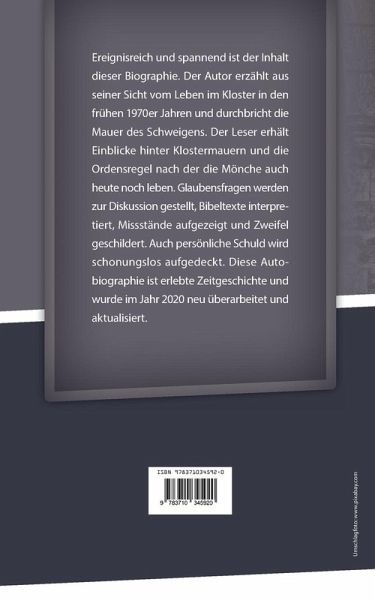 Ereignisreich und spannend ist der Inhalt dieserBiographie. Der Autor erzählt aus seiner Sicht vomLeben im Kloster in den frühen 1970er Jahren unddurchbricht die Mauer des Schweigens. Der Lesererhält Einblicke hinter Klostermauern und dieOrdensregel nach der die Mönche auch heute nochleben. Glaubensfragen werden zur Diskussiongestellt, Bibeltexte interpretiert, Missstände aufgezeigtund Zweifel geschildert. Auch persönlicheSchuld wird schonungslos aufgedeckt.Diese Autobiographie ist erlebte Zeitgeschichteund wurde im Jahr 2020 neu überarbeitet undaktualisiert.