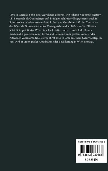 Johann Nestroy: Der Zerrissene. Posse mit Gesang in drei Aufzügen Entstanden 1844. Erstdruck: Wien 1845. Uraufführung am 9.4.1844 in Wien. Neuausgabe mit einer Biographie des Autors. Herausgegeben von Karl-Maria Guth. Berlin 2018. Textgrundlage ist die Ausgabe: Johann Nestroy: Werke. Ausgewählt und mit einem Nachwort versehen von Oskar Maurus Fontana, München: Winkler, 1962. Die Paginierung obiger Ausgabe wird in dieser Neuausgabe als Marginalie zeilengenau mitgeführt. Umschlaggestaltung von Thomas Schultz-Overhage. Gesetzt aus der Minion Pro, 11 pt. Über den Autor: 1801 in Wien als Sohn eines…mehr