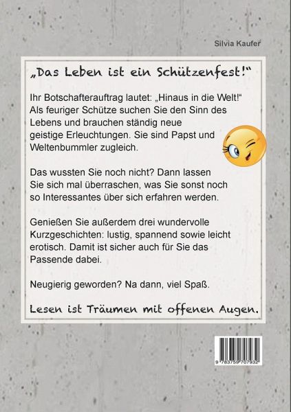 Charmante Sternzeichen-Analyse für den Schütze MannWelchen Mann interessiert es nicht, was für ein Geheimnis hinter seinem Sternzeichen steckt. Es sei dahingestellt, ob er daran glaubt oder nicht. Interessant ist so eine persönliche Astroanalyse allemal.In einem sehr unterhaltsamen astrologischen Part erfährt der Leser etwas über sich, was er vielleicht noch nicht wusste. Das könnte das fehlende Puzzleteil zur Selbsterkenntnis sein. Durch eine persönliche Ansprache im Text bekommt er das Gefühl mittendrin zu sein.Bei einem lustigen Kreuzworträtsel kann er dann noch zeigen, was er astrologisch so alles drauf hat.Ein weiteres Highlight sind die drei wundervollen Kurzgeschichten - spannend, lustig sowie leicht erotisch.1. Ein Wochenend-Trip der etwas anderen Art.Ein lustiger Roman, der aufzeigt, dass die große Liebe auch sehr klein sein kann und, dass nicht immer alles so sein muss, wie es zunächst scheint.2. Charmantes Strandhaus zu verkaufen.Hier stehen Spannung und Vertrauen an erster Stelle. Ein lebenserfahrener Mann muss feststellen, dass man trotz größter Vorsicht Opfer eines Betrügers werden kann.3. Auch ein Haustechniker kann sexy sein.In dieser romantischen Geschichte ist letztendlich ein großes Missverständnis der Schlüssel zum Herzen.
