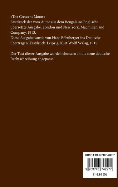 Rabindranath Tagore: Der zunehmende Mond. Gedichte »The Crescent Moon«. Erstdruck der vom Autor aus dem Bengali ins Englische übersetzte Ausgabe: London und New York, Macmillan and Company, 1913. Diese Ausgabe wurde von Hans Effenberger ins Deutsche übertragen. Erstdruck: Leipzig, Kurt Wolff Verlag, 1915. Neuausgabe. Herausgegeben von Karl-Maria Guth. Berlin 2021. Der Text dieser Ausgabe wurde behutsam an die neue deutsche Rechtschreibung angepasst. Umschlaggestaltung von Thomas Schultz-Overhage unter Verwendung des Bildes: Rabindranath Tagore in Kalkutta, 1909. Gesetzt aus der Minion Pro, 11.3 pt. Henricus - Edition Deutsche Klassik GmbH