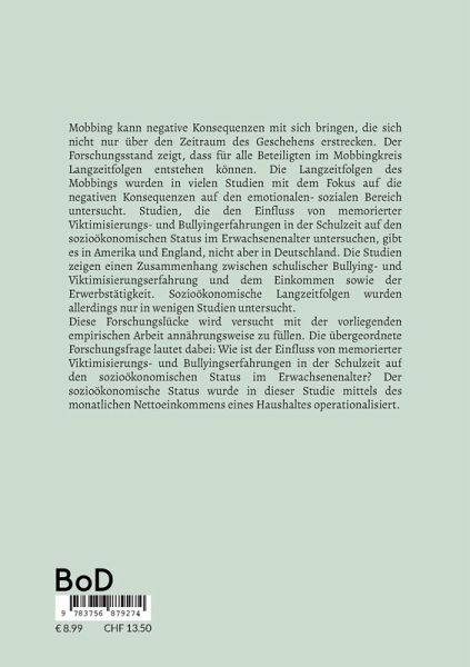 Mobbing kann negative Konsequenzen mit sich bringen, die sich nicht nur über den Zeitraum des Geschehens erstrecken. Der Forschungsstand zeigt, dass für alle Beteiligten im Mobbingkreis Langzeitfolgen entstehen können. Die Langzeitfolgen des Mobbings wurden in vielen Studien mit dem Fokus auf die negativen Konsequenzen auf den emotionalen-sozialen Bereich untersucht. Studien, die den Einfluss von memorierter Viktimisierungs- und Bullyingerfahrungen in der Schulzeit auf den sozioökonomischen Status im Erwachsenenalter untersuchen, gibt es in Amerika und England, nicht aber in Deutschland. Die Studien zeigen einen Zusammenhang zwischen schulischer Bullying- und Viktimisierungserfahrung und dem Einkommen sowie der Erwerbstätigkeit. Sozioökonomische Langzeitfolgen wurden allerdings nur in wenigen Studien untersucht. Diese Forschungslücke wird versucht mit der vorliegenden empirischen Arbeit annährungsweise zu füllen. Die übergeordnete Forschungsfrage lautet dabei: Wie ist der Einfluss von memorierter Viktimisierungs- und Bullyingserfahrungen in der Schulzeit auf den sozioökonomischen Status im Erwachsenenalter? Der sozioökonomische Status wurde in dieser Studie mittels des monatlichen Nettoeinkommens eines Haushaltes operationalisiert.