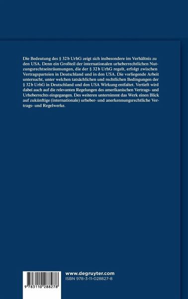 The significance of § 32 b UrhG [German Copyright Law] is especially apparent in relation to the USA. This is because the majority of international copyright licenses regulated by § 32 b UrhG take place between contractual parties in Germany and the USA. The present work investigates the factual and legal conditions under which § 32 b UrhG is effective in Germany and in the USA.