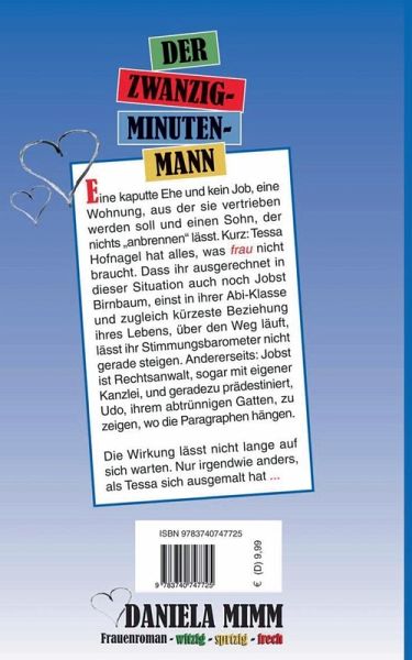 Eine kaputte Ehe und kein Job, eine Wohnung, aus der sie vertrieben werden soll und ein Sohn, der nichts "anbrennen" lässt, kurz: Tessa Hofnagel hat alles, was frau nicht braucht. Dass ihr ausgerechnet in dieser Situation auch noch Jobst Birnbaum, einst in ihrer Abi-Klasse und zugleich kürzeste Beziehung ihres Lebens, über den Weg läuft, lässt ihr Stimmungsbarometer nicht gerade steigen.Andererseits: Jobst ist Rechtsanwalt, sogar mit eigener Kanzlei, und geradezu prädestiniert, Udo, ihrem abtrünnigen Gatten, zu zeigen, wo die Paragraphen hängen.Die Wirkung lässt nicht lange auf sich warten. Nur irgendwie anders, als Tessa sich ausgemalt hat.