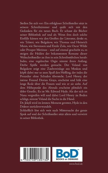 Stellen Sie sich vor: Ein erfolgloser Schriftsteller sitzt in seinem Schreibzimmer und quält sich mit den Gedanken für ein neues Buch. Er schaut die Bücher seiner Bibliothek auf und ab. Wenn ihm doch solche Einfälle kämen wie den Großen der Literatur, denkt er, wie Tolstoi, wie Bulgakow, wie Thomas und Heinrich Mann, wie Stevenson und Emile Zola, wie Oscar Wilde oder Prosper Merimee - und auf einmal geschieht es, es steigen die Helden der bekanntesten Romane dieser Weltschriftsteller zu ihm in sein Schreibstübchen herab: Fürst Oblonski aus "Anna Karenina", Dr. Jekyll von Stevenson, Charlotte Kestner von Thomas Mann, Don Juan von Prosper Merimee, Dietrich Heßling aus Heinrich Manns "Der Untertan", Nana von Emile Zola, Voland, Assasello und der Kater Behemot aus "Der Meister und Margarita" von Michail Bulgakow, Dorian Gray aus "Das Bildnis des Dorian Gray" von Oscar Wilde und schließlich Felix Krull aus "Die Bekenntnisse des Hochstaplers Felix Krull" von Thomas Mann. Eine regelrechte Orgie nimmt ihren Anfang. Derbe Späße werden gemacht. Voland zeigt eine Zaubereinlage aus Moskau und köpft dabei nur so zum Spaß den Heßling, der indes die Prozedur ohne Schaden übersteht. Lord Henry, der intime Freund Dorian Grays, erscheint und hält eine lange Rede über die Frauen und wie er sie sieht. Auf dem Höhepunkt des Abends erscheint plötzlich ein übler Geselle.. Es ist Mr. Edward Hyde. Als der sich an Nana vergreifen will und dabei Lord Henry zu Boden schlägt, nimmt Voland die Sache in die Hand. Dr. Jekyll wird im letzten Moment gerettet, Hyde in den Doktor zurückverwandelt. Schließlich löst sich weit nach Mitternacht der ganze Spuk auf und der Schriftsteller sitzt allein und verwirrt in seiner Bibliothek.