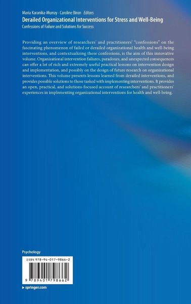 Providing an overview of researchers' and practitioners' "confessions" on the fascinating phenomenon of failed or derailed organizational health and well-being interventions and contextualizing these confessions is the aim of this innovative volume. Organizational intervention failures, paradoxes and unexpected consequences can offer a lot of rich and extremely useful practical lessons on intervention design and implementation and possibly on the design of future research on organizational interventions. This volume presents lessons learned from derailed interventions and provides possible solutions to those tasked with implementing interventions. It provides an open, practical and solutions-focused account of researchers' and practitioners' experiences in implementing organizational interventions for health and well-being.