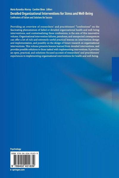 Providing an overview of researchers' and practitioners' "confessions" on the fascinating phenomenon of failed or derailed organizational health and well-being interventions and contextualizing these confessions is the aim of this innovative volume. Organizational intervention failures, paradoxes and unexpected consequences can offer a lot of rich and extremely useful practical lessons on intervention design and implementation and possibly on the design of future research on organizational interventions. This volume presents lessons learned from derailed interventions and provides possible solutions to those tasked with implementing interventions. It provides an open, practical and solutions-focused account of researchers' and practitioners' experiences in implementing organizational interventions for health and well-being.
