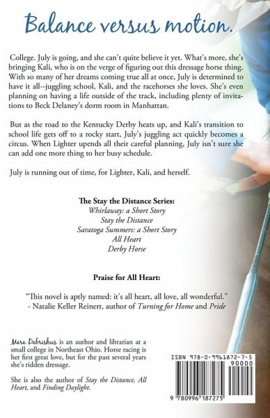 College. July is going, and she can’t quite believe it yet. What’s more, she’s bringing Kali, who is on the verge of figuring out this dressage horse thing. With so many of her dreams coming true all at once, July is determined to have it all--juggling school, Kali, and the racehorses she loves. She’s even planning on having a life outside of the track, including plenty of invitations to Beck Delaney’s dorm room in Manhattan. But as the road to the Kentucky Derby heats up, and Kali’s transition to school life gets off to a rocky start, July’s juggling act quickly becomes a circus. When Lighter upends all their careful planning, July isn’t sure she can add one more thing to her busy schedule. July is running out of time, for Lighter, Kali, and herself.