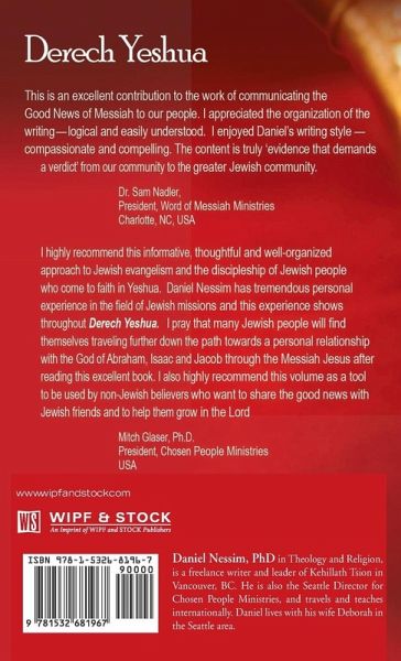 How does a Jewish person in the 21st century explore the question of whether Yeshua (Jesus) is the Messiah of Israel? And if a Jew has an epiphany through a dream or experience that Yeshua is the Son of God, what next? What are the first steps to follow Him who said, Follow me? In Derech Yeshua, Daniel Nessim provides responsible answers to these questions from the Hebrew Scriptures and New Testament, and in a way that affirm unequivocally that Jews who embrace Yeshua as the Son of David, the Moshiach of Israel, are called by God to remain Jews and not leave behind their Judaism. This book is a must-read for all fellow members of the tribe who want to know more about Jesus. --David Rudolph, PhD, Professor of New Testament and Jewish Studies, The King's University This is an excellent contribution to the work of communicating the Good News of Messiah to our people. I appreciated the organization of the writing -- logical and easily understood. I enjoyed Daniel's writing style -- compassionate and compelling. The content is truly 'evidence that demands a verdict' from our community to the greater Jewish community. --Sam Nadler, President, Word of Messiah Ministries I highly recommend this informative, thoughtful and well-organized approach to Jewish evangelism and the discipleship of Jewish people who come to faith in Yeshua. Daniel Nessim has tremendous personal experience in the field of Jewish missions and this experience shows throughout Derech Yeshua. I pray that many Jewish people will find themselves traveling further down the path towards a personal relationship with the God of Abraham, Isaac and Jacob through the Messiah Jesus after reading this excellent book. I also highly recommend this volume as a toll to be used by non-Jewish believers who want to share the good news with Jewish friends and to help them grow in the lord. --Mitch Glaser, President, Chosen People Ministries