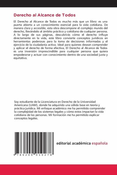 El Derecho al Alcance de Todos es mucho más que un libro: es una puerta abierta a un conocimiento esencial para la vida cotidiana. De manera clara y accesible, esta obra descompone el complejo mundo del derecho, llevándolo al ámbito práctico y cotidiano de cualquier persona. A lo largo de sus páginas, descubrirás cómo el derecho influye directamente en la vida, este libro convierte conceptos jurídicos en herramientas poderosas para la toma de decisiones informadas y el ejercicio de la ciudadanía activa. Ideal para quienes desean comprender y aplicar el derecho de forma efectiva, El Derecho al Alcance de Todos es una inversión imprescindible para cualquier persona que quiera empoderarse y actuar con conocimiento dentro de una sociedad justa y equitativa.