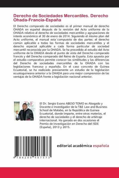 El Derecho comparado de sociedades es el primer manual de derecho OHADA en español después de la revisión del Acto uniforme de la OHADA relativo al derecho de sociedades mercantiles y agrupaciones de interés económico el 30 de enero de 2014. Siguiendo el mismo plan del Acto uniforme, el manual estäcompuesto de dos partes: el derecho común aplicable a todas las formas de sociedades mercantiles y el derecho especial aplicable a cada forma particular de sociedad mercantil reconocida por la OHADA. Se ha procedido al estudio del Acto uniforme de la OHADA desde el punto de vista del Derecho comparado francés y del Derecho comparado del Reino de España. Esta apuesta por el estudio comparativo permite conocer las similitudes y las diferencias del Derecho de sociedades mercantiles de la OHADA con las legislaciones francesa y española. En el caso concreto de Guinea Ecuatorial, se ha realizado previamente un estudio de la legislación ecuatoguineana anterior a la OHADA para una mejor comprensión de las ventajas de la OHADA frente a legislación nacional anterior.