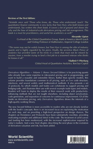Derivatives Algorithms - Volume 1: Bones (Second Edition) is for practicing quants who already have some expertise in risk-neutral pricing and in programming, and want to build a reusable and extensible library. Rather than specific models, this volume provides foundations common to all pricing, such as C++ code structure, interfaces, and several widely used mathematical methods. It also presents a set of protocols, by which models and trades can collaborate to support pricing and hedging tasks, and illustrates their use with several example trade types and models. Readers will learn to deploy the results of their research work with productivity-enhancing methods that are not taught elsewhere, including object serialization, code generation, and separation of concerns for continuous improvement. Of all the books on derivatives pricing, only Derivatives Algorithms shows the internals of a high-quality working library. The new Second Edition is more accessible to readers who are not already familiar with the book's concepts; there is an increased focus on explaining the motivation for each step, and on providing a high-level perspective on design choices. The chapters on Persistence and Protocols have been substantially rewritten, providing motivating examples and additional detail in the code. The treatment of yield curves and funding has been modernized, with the increased sophistication required by today's markets. And a new final chapter, describing the next phase in the evolution of derivatives valuation and risk, has been added.