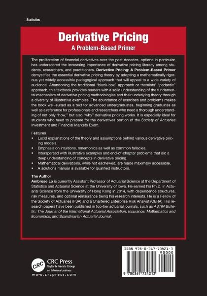 The proliferation of financial derivatives over the past decades, options in particular, has underscored the increasing importance of derivative pricing literacy among students, researchers, and practitioners. Derivative Pricing: A Problem-Based Primer demystifies the essential derivative pricing theory by adopting a mathematically rigorous yet widely accessible pedagogical approach that will appeal to a wide variety of audience. Abandoning the traditional "black-box" approach or theorists' "pedantic" approach, this textbook provides readers with a solid understanding of the fundamental mechanism of derivative pricing methodologies and their underlying theory through a diversity of illustrative examples. The abundance of exercises and problems makes the book well-suited as a text for advanced undergraduates, beginning graduates as well as a reference for professionals and researchers who need a thorough understanding of not only "how," but also "why" derivative pricing works. It is especially ideal for students who need to prepare for the derivatives portion of the Society of Actuaries Investment and Financial Markets Exam. ¿ Features Lucid explanations of the theory and assumptions behind various derivative pricing models. Emphasis on intuitions, mnemonics as well as common fallacies. Interspersed with illustrative examples and end-of-chapter problems that aid a deep understanding of concepts in derivative pricing. Mathematical derivations, while not eschewed, are made maximally accessible. A solutions manual is available for qualified instructors. The Author Ambrose Lo is currently Assistant Professor of Actuarial Science at the Department of Statistics and Actuarial Science at the University of Iowa. He received his Ph.D. in Actuarial Science from the University of Hong Kong in 2014, with dependence structures, risk measures, and optimal reinsurance being his research interests. He is a Fellow of the Society of Actuaries (FSA) and a Chartered Enterprise Risk Analyst (CERA). His research papers have been published in top-tier actuarial journals, such as ASTIN Bulletin: The Journal of the International Actuarial Association, Insurance: Mathematics and Economics, and Scandinavian Actuarial Journal. ¿